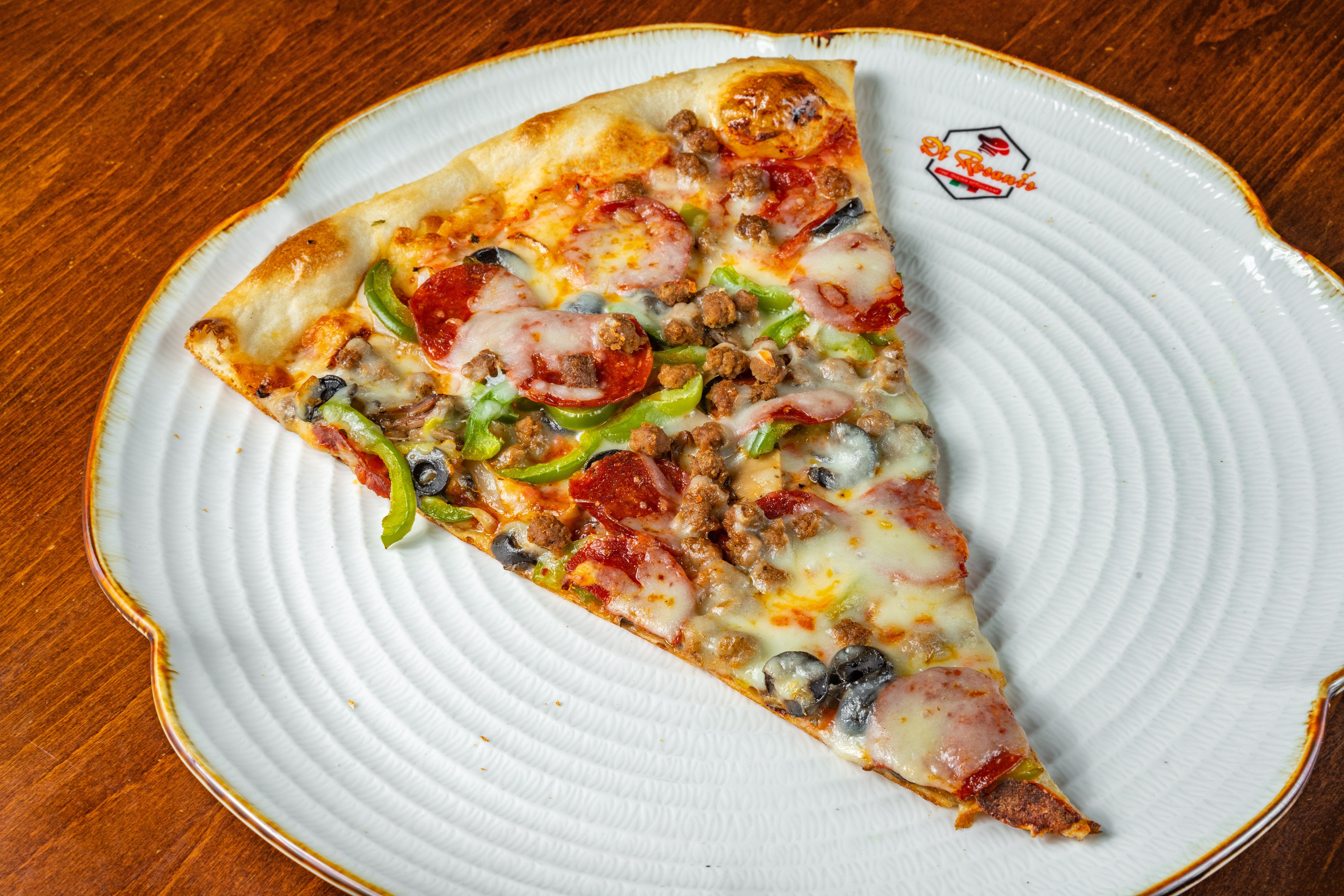 Pepperoni, sausage, mushrooms, green peppers, onions, black olives. Jalapenos upon request.