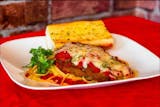 Spaghetti and chicken breast topped with onions, mushrooms and melted mozzarella.
