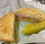 Cheddar, mozzarella, parmesan, Genoa salami, turkey breast, and ham. Topped with lettuce, tomatoes, onions, and mustard.