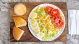 Lettuce, tomatoes, cheddar, mozzarella, and a hard-boiled egg.