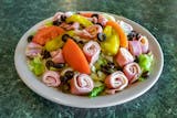 Ham, salami, cheese rolls on a bed of lettuce, tomato, black olives, pepperoncini peppers, onions.