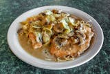 Breaded chicken, sauteed with mushrooms, garlic in a cream sauce and a touch of tomato sauce over pasta.