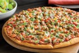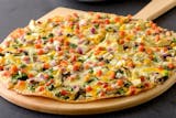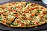 Our artisan thin crust, topped with creamy garlic sauce, whole-milk mozzarella, fresh spinach, sliced zucchini, sliced mushrooms, marinated artichoke hearts, Roma tomatoes, mixed onions, cheddar, and herb & cheese blend.