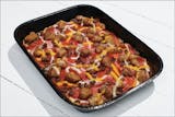 Traditional red sauce, whole-milk mozzarella, premium pepperoni, italian sausage, ground beef, sliced mushrooms, mixed onions, green peppers, black olives, and cheddar. To make this keto-friendly, simply change the traditional red sauce to creamy garlic sauce or olive oil & garlic sauce. Macro for this entire tray with the default build are fats: 104g, proteins: 77g, carbs: 33g.