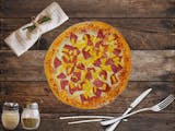 This gourmet delight features a harmonious blend of succulent, sliced premium ham and juicy, golden pineapple, all atop a crisp, crust. The fusion of sweet and savory flavors is perfectly complemented by a rich tomato sauce and a generous layer of melted mozzarella cheese.