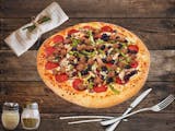 This culinary masterpiece brings together a symphony of premium ingredients, including savory Italian sausage, spicy pepperoni, fresh bell peppers, earthy mushrooms, and sweet onions. Each element is carefully selected and artfully arranged on a crispy, hand-tossed crust, then topped with mozzarella cheese and a rich tomato basil sauce.
