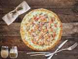Alfredo sauce with chicken garlic fresh tomatoes and mushroom. This elegant creation features tender, marinated chicken breast and a medley of wild mushrooms, all nestled atop a creamy Alfredo sauce. The perfectly crisp baked crust provides the ideal foundation for the rich and velvety topping, while a sprinkle of garlic and fresh tomato adds a touch of sophistication.