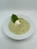 Burrata ravioli in a homemade marinara sauce topped with shredded parmesan