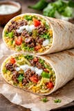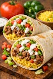 Ground Beef with onions green peppers lettuce tomatoes yellow rice white sauce Burrito.