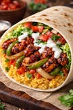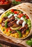 Lamb with onions green peppers lettuce tomatoes yellow rice white sauce Burrito.