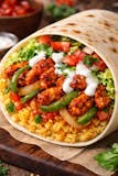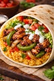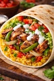 Grilled chicken with onions green peppers lettuce tomatoes yellow rice white sauce Burrito.