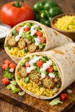 falafel with onions green peppers lettuce tomatoes yellow rice white sauce Burrito.