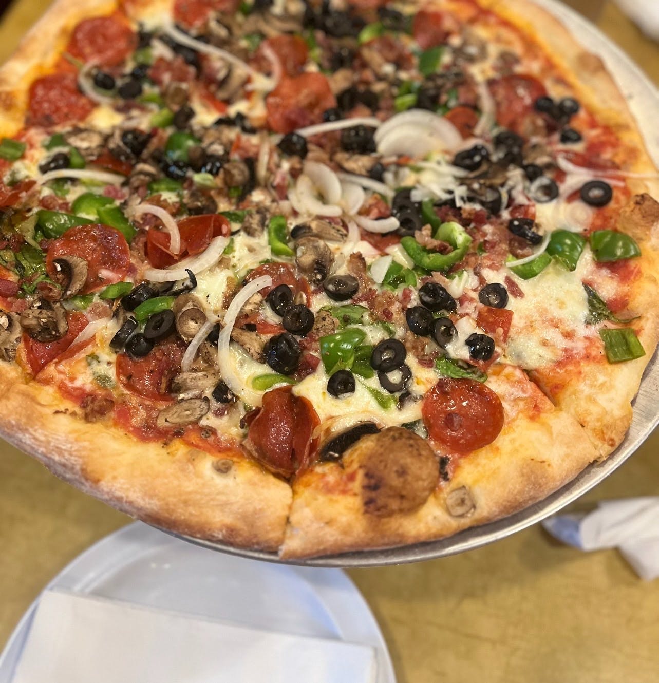 Pepperoni, sausage, green peppers, onion & mushrooms.