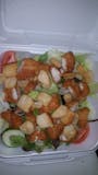 With lettuce, tomatoes, cucumbers, onions, croutons.