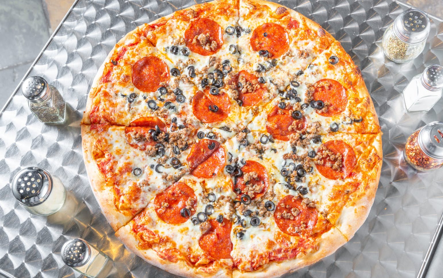 Our tomato sauce with mozzarella, sausage, pepperoni & olives.