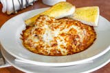Spaghetti, Marinara sauce, Chicken Breast Breaded, Parmesan & Mozzarella cheese. Baked