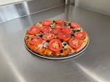 Fire-roasted tomato, artichoke hearts, kalamata olives, roasted red pepper, garlic, red onion, Italian seasoning, feta, mozzarella & provolone cheese blend.