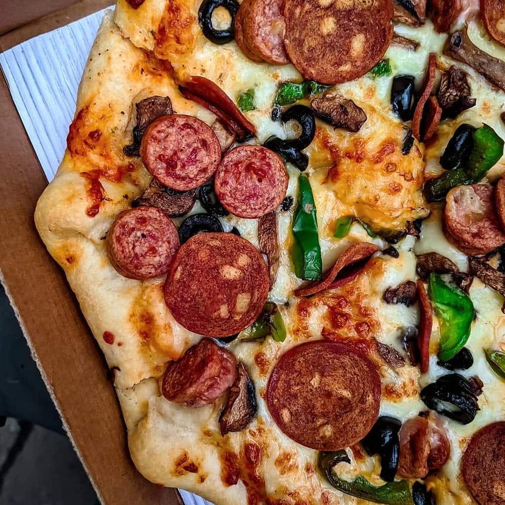 Sausage, mushroom, pepperoni, green olive, onion, green pepper and bacon.