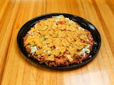 Bean sauce, seasoned beef & sausage, blended cheese, topped with lettuce, tomatoes, chips, black olives, and onions.