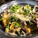 Alfredo sauce, roasted mushrooms, spinach parmesan. (Vegetarian).