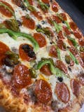 Sausage, pepperoni, green peppers, black olives, onions & mushrooms.