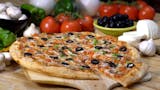 The vegetarian's favorite. Comes with mozzarella, mushroom, onion, green pepper, black olives, and tomatoes